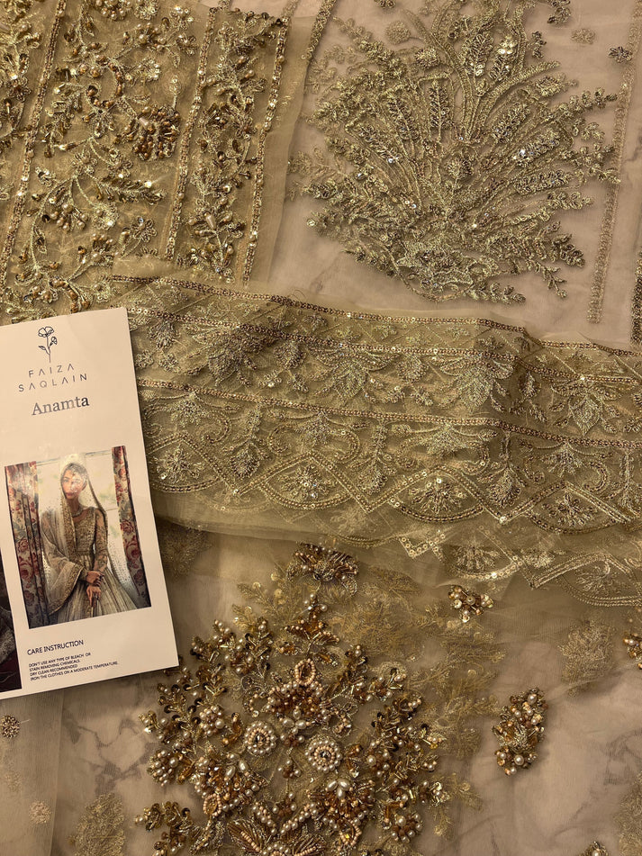 Description: An ivory tulle double layered pishwas, hand worked using dabka, zardozi and hand cut sitara.