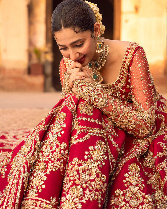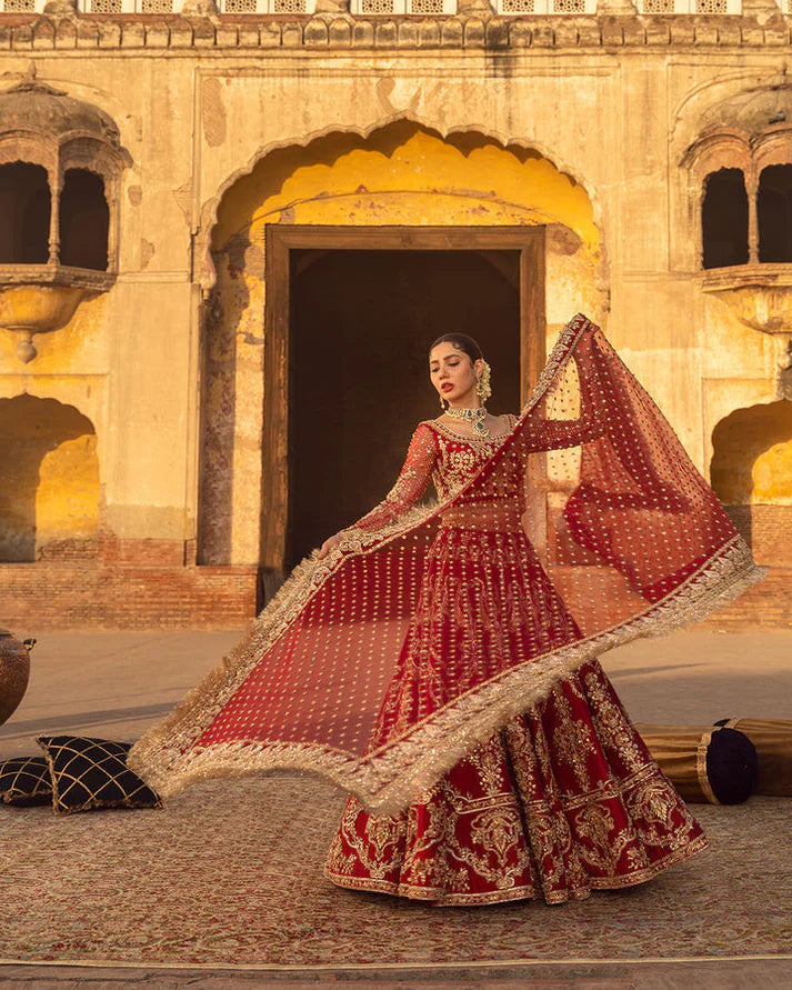 Description: Crafted on a luxurious red canvas of fine spun raw silk, Arusa manifests timeless luxury. The lustrous lehnga set is adorned with floral bouquets set within delicately ornate arches gleaned from iconic Mughal inlay art. Patterns of brimming floral vases are wrought by master craftsmen using hand techniques like zardosi, kora and dabka. Paired with a delicately hand crafted dupatta, Arusa is symphony of grace and opulence.