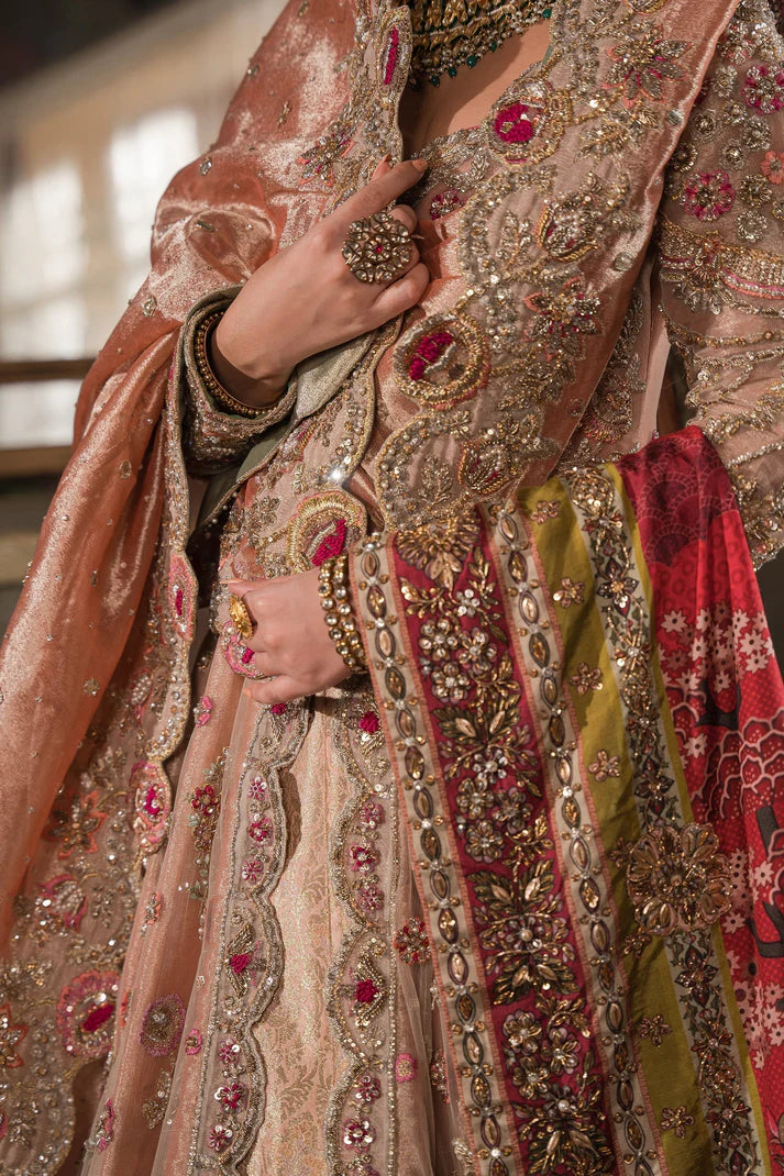For a barat bride, a soft coral with gold zardozi work and hints of resham is regal and stunning. A rich peach tissue dupatta adds an old world charm with heavily worked borders with resham knots ending in delicate scalloped edges. Floral bunches cover the panels crafted in zardozi alongwith a brocade lehnga with an ornately crafted border to complete the look.