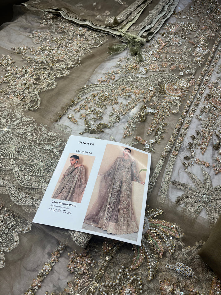 Elevate your bridal glow with the Rubinaaz “Dahlia” Gown, a breathtaking creation in muted gold and soft skin tones. Expertly crafted on a delicate net canvas, this gown features a mesmerizing blend of multihued pastel embroidery paired with luxe gangajamni motifs, shimmering sheesha mirrors, and intricate dabka and katdana craftsmanship. Complete the ensemble with a ravishing net dupatta detailed with sequin lace and striking raw silk crushed pants adorned with organza borders, making this a statement piece for unforgettable wedding moments.