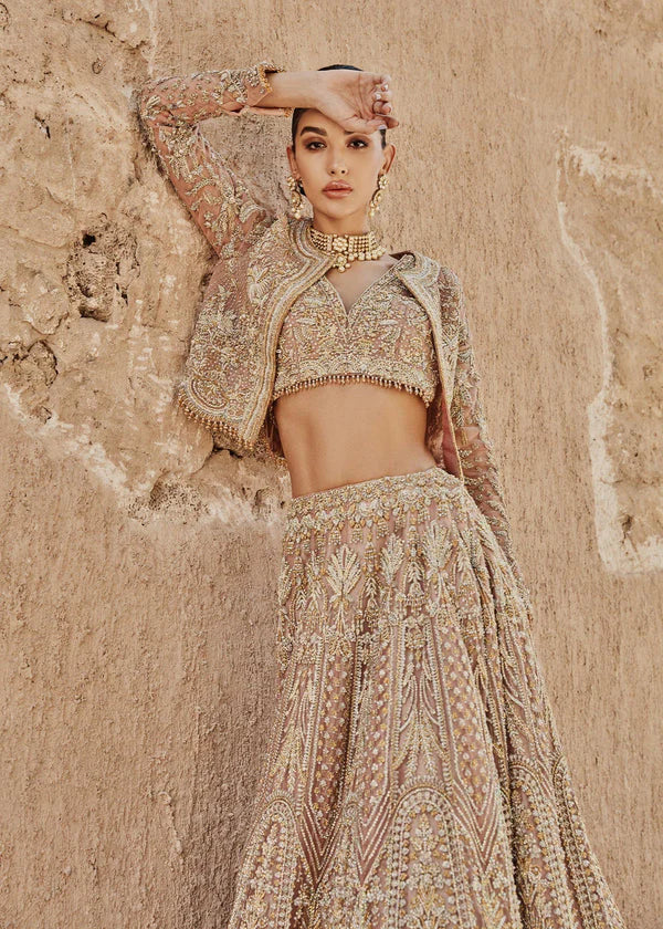 Yellow Golden master pc Lehenga Choli Dress Indian Bridal Wear is heavily decorated in golden white extensive worked open shoulder blouse paired with self-brocade panel lehnga with beautifully embroidered entire ghair in shades of ivory blossom pink and golds in traditional Organza fabric and Net Embroidered Choli. Your next wedding outfit is waiting for you. Golden Lehenga Choli: Take all the guests' attention with your exquisite look with one of the best master pc outfits of saira shakira . Comprising of a Golden organza round neckline blouse with complete zardozi work. This exceptionally embellished choli is paired with a jacket outfit which is organized with a fawn organza base choli which is sprayed with sequins glorifying its grace. Golden organza choli is emphasized with floral bunches done with kora, dabka, tilla, and sequins work. Making it true that you can turn all the heads around with your gorgeous ability to wear the outfit in a way that is spectacular. Golden Lehenga: Elevate your style this season with our fashion-forward designs. An artistic vision of classic style and luxurious detailing, transpire into a truly romantic and iconic bridal for your big day. An eye-captivating long silhouette is fully illustrated with antique embellishments all over. Furthermore, it is emphasized with an embellished waist belt and scalloped borders. Compliment the look with a wide-flared lehenga. The combination of gold work on organza is absolutely breathtaking in its amazing Style. The Lehenga incorporates beautifully designed borders having sprinkled sequins to give it a perfect maharani look. Bridal Dupatta: An artistic vision of classic style and luxurious detailing transpires into a genuinely romantic and iconic bridal wear for your big day, which will complete in this beautiful golden lehnga choli paired with a net chiffon dupatta.