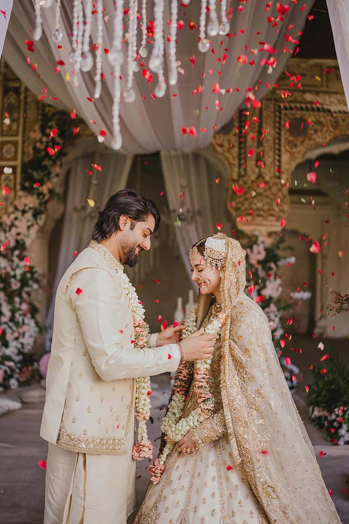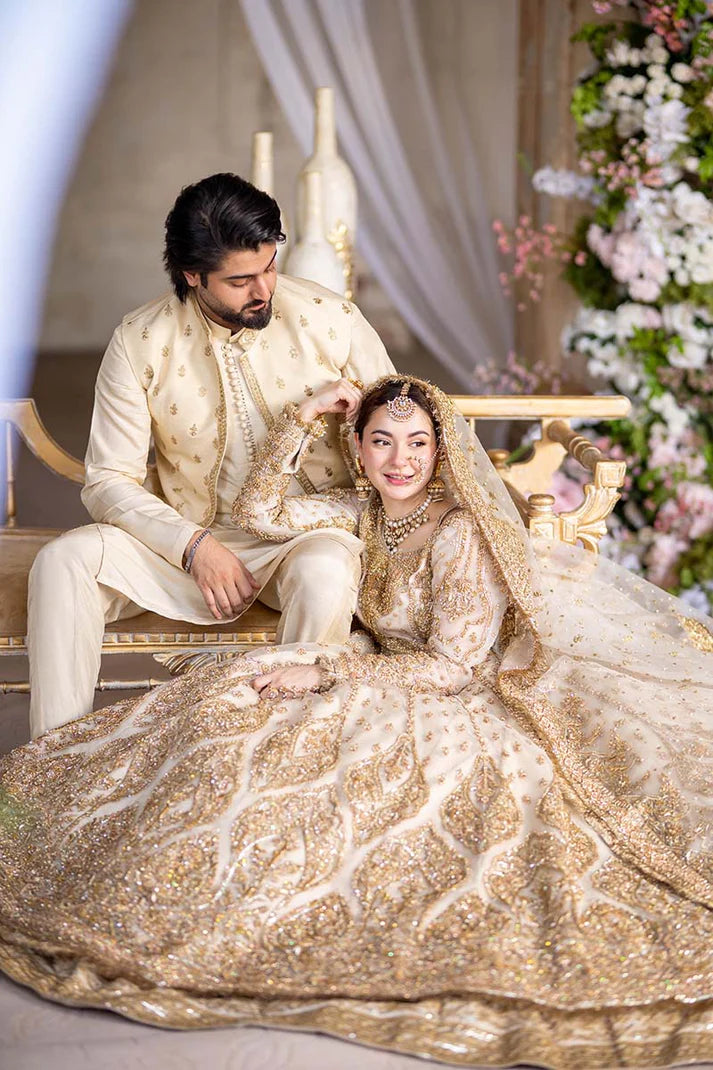 An offwhite organza pishwas and duppata paired with raw silk lehnga is heavily embellished with zarri, dabka, sequence and resham