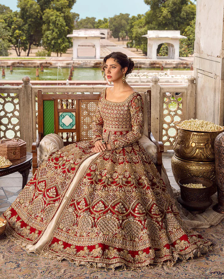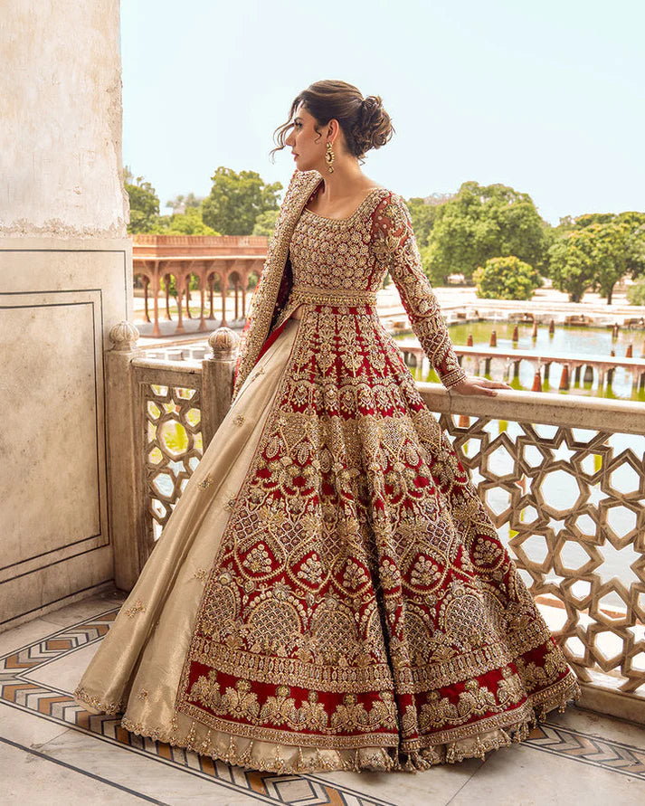 Description: A fascinating fusion of luxurious artworks, Juri is a timeless silhouette richly adorned with scintillating works like zari, sequins and zardozi. The pishwas features decorative arabesques filled with bejewelled dabbi jaal while its bodice is laden with intricate booti of tilla, dabka, sequins and crystals. This open-cut silhouette is impeccably crafted in organza and paired with a fully bedecked dupatta making it a modern heirloom.