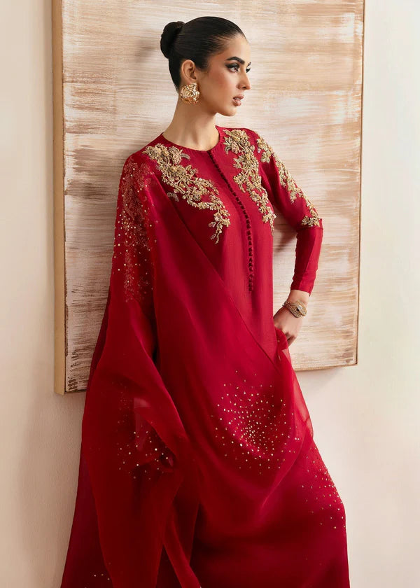 Indulge in the opulence of Rosina, where classic femininity meets modern design. The deep crimson silk offers a graceful flow that complements the figure, while the meticulously hand-embellished neckline and sleeves lend texture and visual intrigue. The cigarette pants are tailored to perfection, providing a sharp, modern balance to the flowing top. The Kathan organza dupatta, adorned with scattered embellishments, creates an ethereal aura that softens the look, adding depth and movement.
