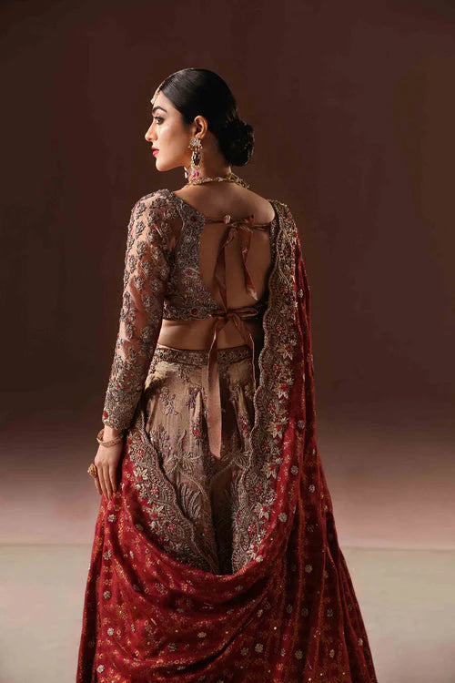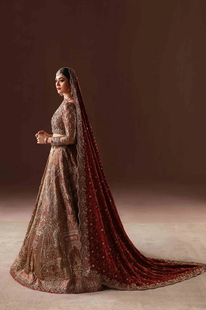 An immaculate vision of grandeur comes to life in this design which exudes an old world charm. Finely crafted flora and fauna cover the lehnga with intricate zardozi work with touches of rust resham. Hints of gilded golden 'succha' gota add further beauty to this regal design. The zari net dupatta is hand dyed to a gorgeous rust colour with heavily embellished borders all around. Fine dapka and resham work enhance the beauty alongwith an all over hand made flower booti. The choli is covered in a full jaal with beautiful flowers and delicate leaves crafted in fine dapka and resham, with fine sequins to add a sheen.