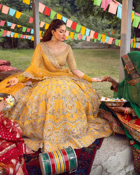 Description: A yellow tulle and silk lehnga choli set featuring floral motifs and bootis wrought using dabka, zardozi and resham among other hand embroidery techniques.Handcrafted with meticulous care, our pieces have a lot of diligence and love invested in them. The exquisite craftsmanship requires laborious hours.